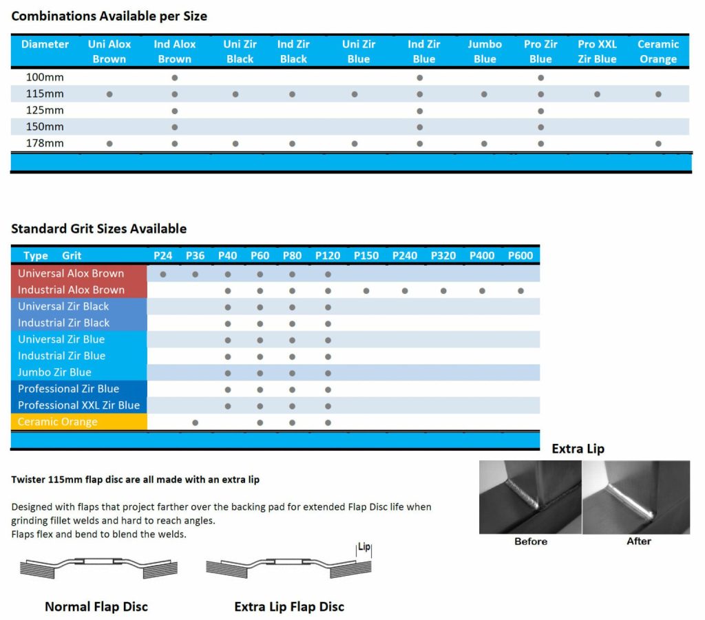 Twister Flap Discs are designed for grinding, dressing, deburring, polishing, and surface blending on all types of materials and welds.